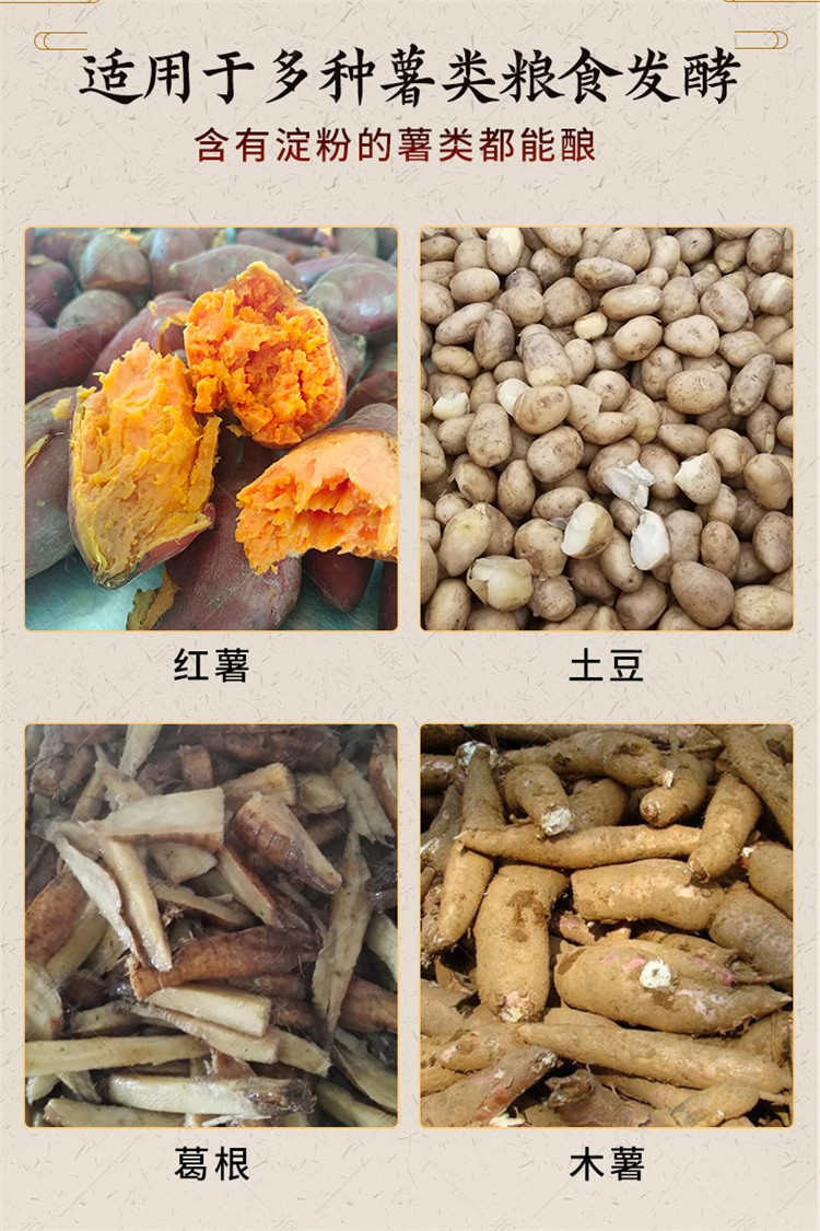 主要是用來發酵含有澱粉和糖份的紅薯、土豆、木薯、葛根等薯類作物。